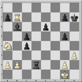 31…Txb2!! 32.Cxb2 (les Blancs n’ont pas vraiment le choix.) 32…c3 33.Txb6 (forcé car sur : 33.Cd3? c4+ 34.Txb6 ((34.Rf1 cxd3 35.Re1 Fe3!–+)) 34…cxd3! 35.Td6 c2 36.Txd3 c1D+ 37.Rh2 Dc2–+ et il n’y aura pas de forteresse, car le pion a2 va tomber.) 33…c4! (empêche Cd3, tandis que la menace est 34…c2.) 34.Tb4 (34.Cxc4 c2 35.Tc6 c1D+ 36.Rh2 e5–+ car après : 37.Cxe5 Df4+ 38.Rh1 Dxe5–+) 34…a5!! (les trois pions dominent les deux pièces blanches ! Après : 34…cxb2? 35.Txb2+-; et sur : 34…c2?? 35.Txc4+-) 35.Cxc4 c2 (au prochain coup, le pion c2 va à promotion.) 0–1