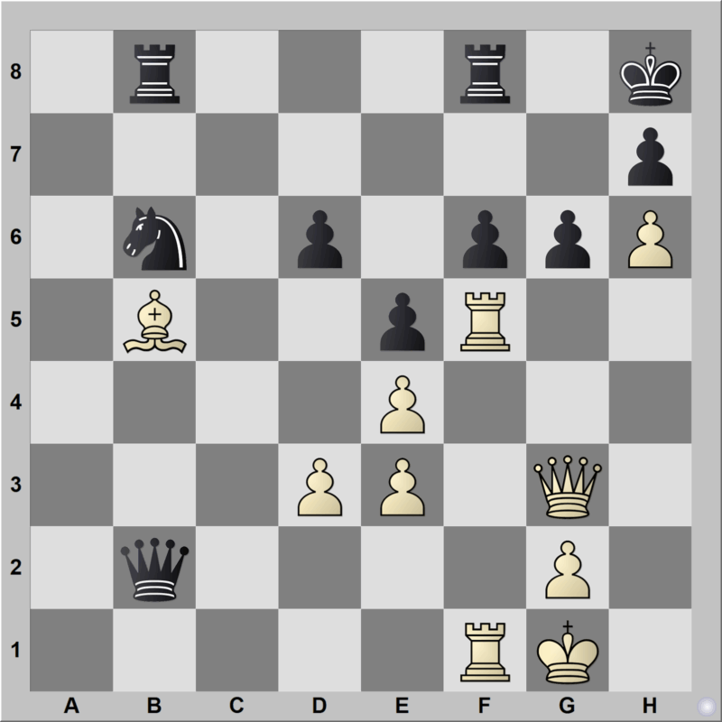 26.Dg5!! (splendide ! Les noirs sont sans défense.) 26…Dxb5 (26…fxg5?? 27.Txf8+ Txf8 28.Txf8#) 27.Txf6 Tfe8 (27…Txf6 28.Dxf6+ Rg8 29.Dg7#) 28.Txg6! Cd7 (28…hxg6 29.Df6+ Rh7 30.Dg7#) 29.Tg7 (So abandonne avant : 29…Tg8 ((29…Dxd3?? 30.Txh7+ Rxh7 31.Dg7#)) 30.Txg8+ Txg8 31.Tf8 Db1+ 32.Rh2 Cxf8 ((32…Txf8 33.Dg7#)) 33.Df6+ Tg7 34.Dxg7#) 1–0