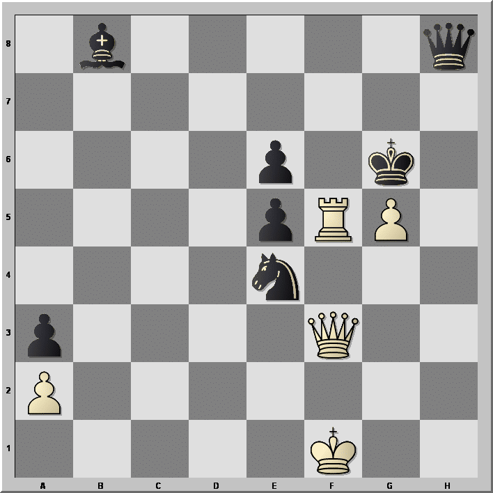 Solution : 1.Tf8! (après : 1.Dxe4? Dh3+ 2.Re2 exf5–+) 1…Cd2+ 2.Rg2 Dh2+! (si : 2…Dg7? 3.Dd3+ e4 ((3…Rxg5 4.Tg8 Dxg8 5.Dg3++-)) 4.Dd8!) 3.Rxh2 Cxf3+ 4.Rg3 (la prise perd sur le champ : 4.Txf3? e4+ 5.Rg2 exf3+ 6.Rxf3 Rxg5–+) 4…Fd6 5.Tf6+! (pour éliminer son propre pion et forcer le roi noir à occuper le terrain. Après : 5.Td8? Cxg5 6.Txd6 Ce4+–+) 5…Rxg5 (5…Rg7? 6.Rxf3+-) 6.Txf3 e4+ 7.Rh3! exf3 (c’est pat!) 0,5 – 0,5 : 1.Tf8! (après : 1.Dxe4? Dh3+ 2.Re2 exf5–+) 1…Cd2+ 2.Rg2 Dh2+! (si : 2…Dg7? 3.Dd3+ e4 ((3…Rxg5 4.Tg8 Dxg8 5.Dg3++-)) 4.Dd8!) 3.Rxh2 Cxf3+ 4.Rg3 (la prise perd sur le champ : 4.Txf3? e4+ 5.Rg2 exf3+ 6.Rxf3 Rxg5–+) 4…Fd6 5.Tf6+! (pour éliminer son propre pion et forcer le roi noir à occuper le terrain. Après : 5.Td8? Cxg5 6.Txd6 Ce4+–+) 5…Rxg5 (5…Rg7? 6.Rxf3+-) 6.Txf3 e4+ 7.Rh3! exf3 (c’est pat!) 0,5 – 0,5